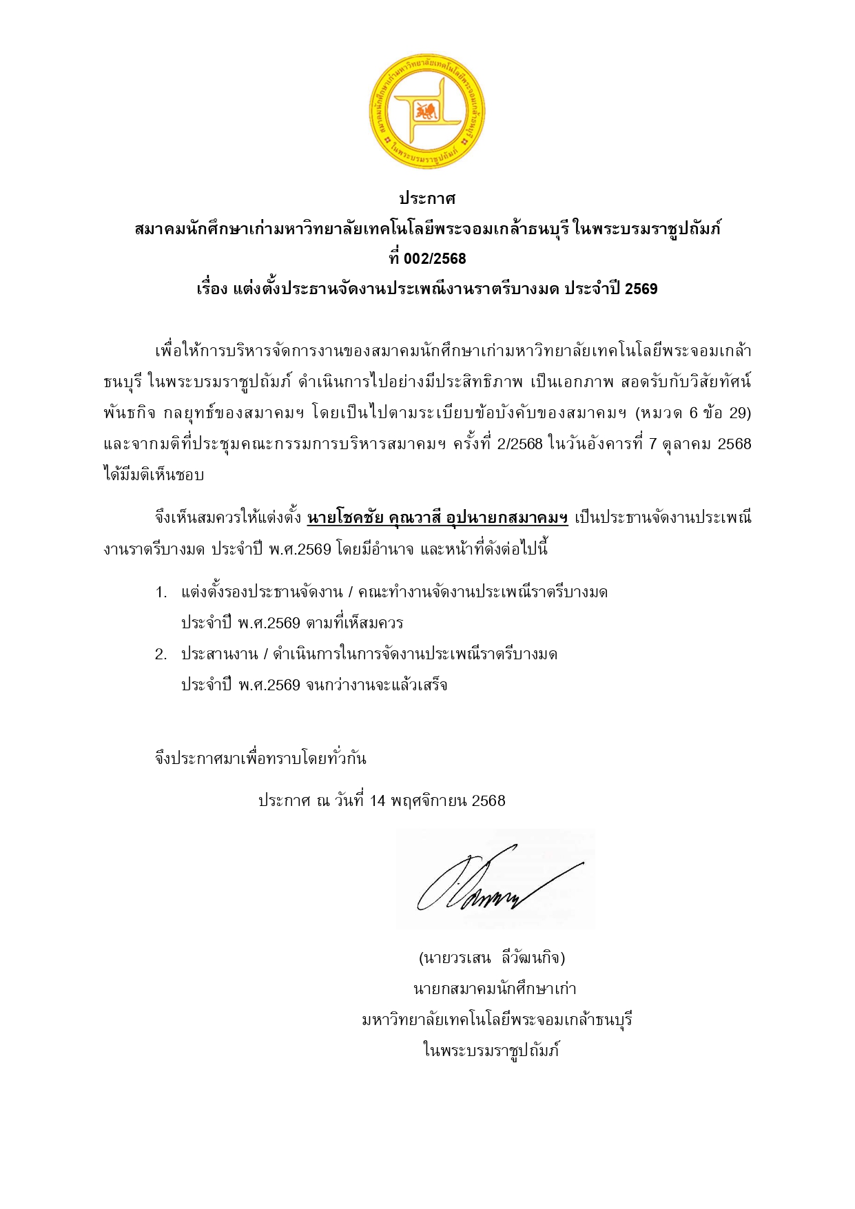 ประกาศที่ 002/2568 แต่งตั้งประธานจัดงานประเพณีราตรีบางมด ประจำปี 2569