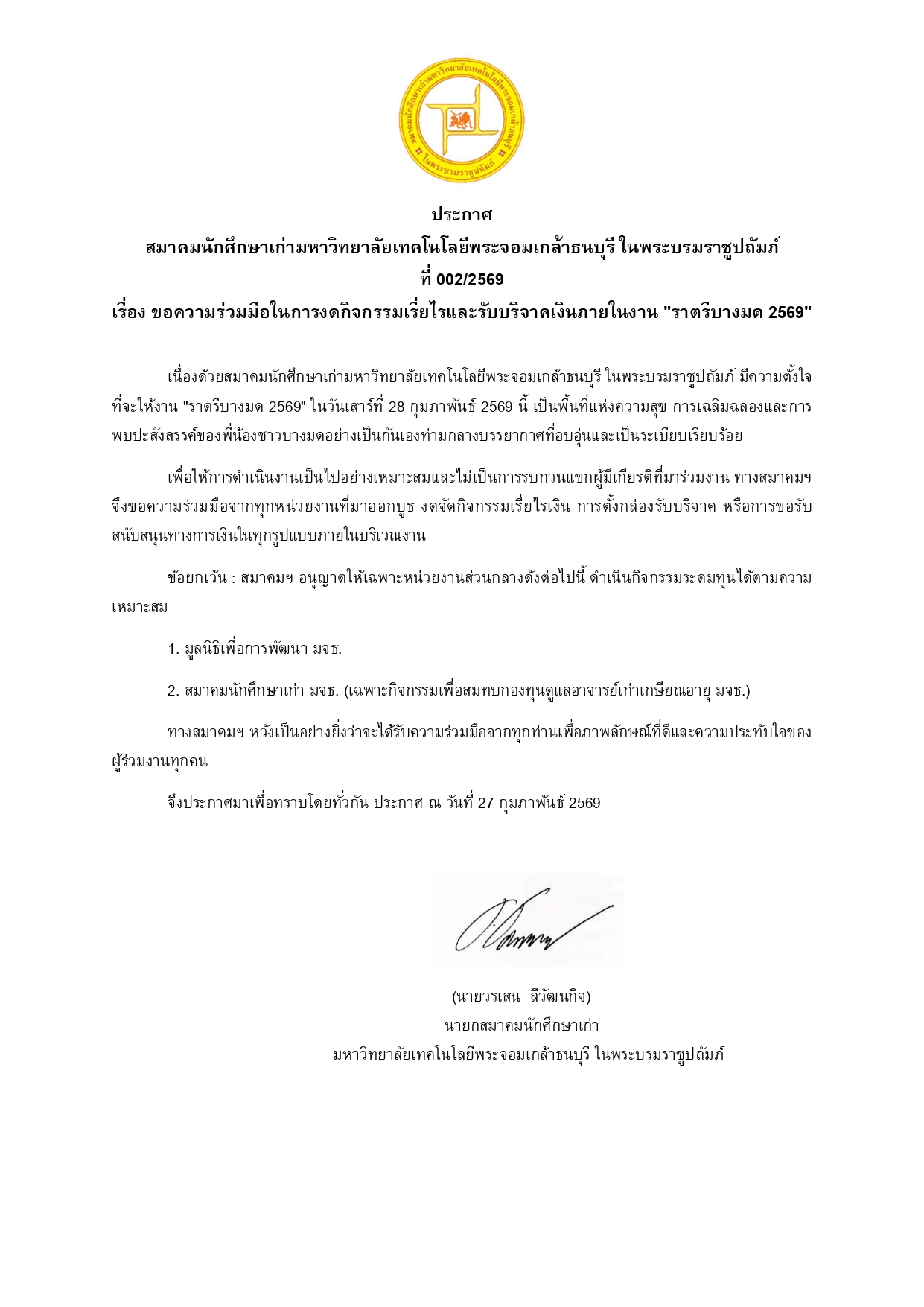 ประกาศที่002/2569 เรื่องขอความร่วมมือในการงดกิจกรรมเรี่ยไรและรับบริจาคเงินภายในงานประเพณีราตรีบางมด 2569